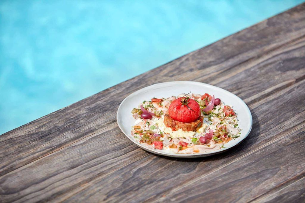 Les mets sont composés avec les légumes bio stars du moment, cueillis à maturité et cuisinés dans la foulée avec des touches carnées et iodées locales. Coup de cœur pour le pressé d’aubergine, caponata de légumes d’été, ricotta au lait bio de la ferme du village, et caviar d’aubergines lactofermentées, véritable burger végétarien, servi à température ambiante, qui explose de saveurs.